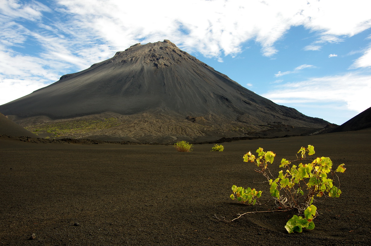 L’isola di Fogo sembra un ventaglio spagnolo rovesciato. Lingue di lava solidificata scendono dal cono vulcanico che sfiora i tremila metri di altezza. Il nero della pietra lavica ricca di minerali ferrosi domina il paesaggio. Ai piedi del cratere la terra fertile carezzata dagli alisei dà uva da vino e caffè di ottima qualità.