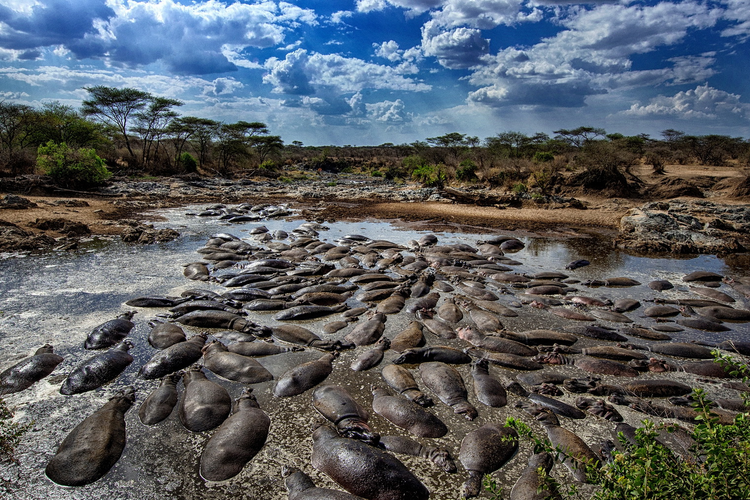 Tra i protagonisti assoluti del parco ci sono anche gli ippopotami, che popolano in gran numero le pozze fangose dei fiumi stagionali. Durante la stagione secca, quando il livello dell’acqua si abbassa drasticamente, centinaia di ippopotami si ammassano negli ultimi specchi d’acqua rimasti. Le lotte territoriali tra i maschi diventano frequenti e spettacolari, mentre i richiami profondi degli animali riecheggiano nelle pianure. In alcuni casi le pozze si riempiono a tal punto che gli ippopotami sono costretti a vivere praticamente uno sopra l’altro.